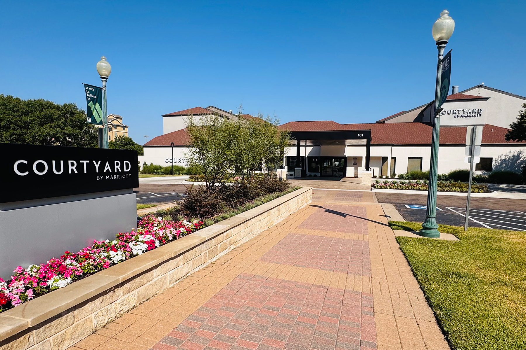 The Courtyard by Marriott hotel is located downtown on the banks of the Brazos River. Their location across the street from the Waco Convention Center and 1 mile from Baylor University make the hotel an ideal choice when visiting the area. Start your day right with a cooked-to-order breakfast in The Bistro and relax in the evening by the outdoor heated pool or catching up with friends in the Lobby Bar. Each guest room in the hotel features luxurious Marriott bedding, upscale bathroom amenities, and a mini-refrigerator. Your stay is sure to be productive with free wireless internet, spacious well-lit work desks, and a 24-hour business center.
